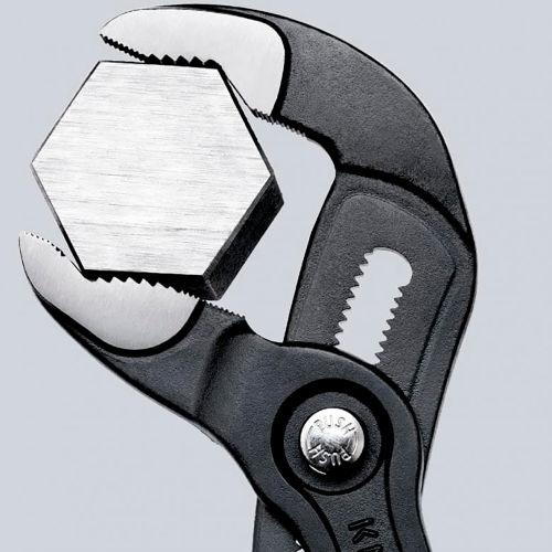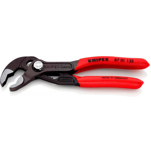 Push the button for adjustment on the workpieceFine adjustment for optimum adaptation to different sizes of workpieces and a comfortable handle widthSelf-locking on pipes and nuts: no slipping on the workpiece and low hand force requiredGripping surfaces with special hardened teeth, teeth hardness approx. 61 HRC: high wear resistance and stable grippingBox-joint design for high stability due to double guideReliable catching of the hinge bolt: no unintentional shiftingPinch guard prevents operators' fingers being pinched125 mm small, gripping capacity for tubes 29 mm, gripping capacity for nuts 27 mm, weight 85 gChrome vanadium electric steel, forged, multi stage oil-hardenedOur smallest high-tech water pump pliers Minimum size maximum quality 85 g light and 125 mm long: that is the Knipex 87 01 125 Cobra. The Mini-Cobra fits in any pocket. Despite this, its gripping capacity is a proud 27 mm. The benefits of working with these versatile pliers are plain to see: they are light and stable, can be positioned on the component quickly and are self-locking, e.g. on pipes and nuts. With their plastic-coated handles, the Knipex Cobra sits firmly in the hand. Like an extension of the finger The Mini Cobra shows its strengths when a component is too small, too dirty or too hot for you to hold it by your fingers. Due to its small size, it can get difficult-to-reach components, and grips without slipping. To achieve a lasting secure "bite" on the work component, we use high-frequency current to bring the gripping teeth to a hardness of approx. 61 HRC. Thanks to the 13-fold fine adjustment, the Cobra can be ideally adjusted to different sizes of component. With its small size, the Mini-Cobra is suitable for work involving precision engineering and is ideal for the assembly of furniture and fittings. DIY and hobby enthusiasts and model makers will find a top quality, versatile tool in the Mini-Cobra. Small, tough and strong We forge the Knipex Mini-Cobra from chrome vanadium steel and use a multiple stage hardening process to give it the ideal balance between hardness and toughness. This makes it extremely durable. The Knipex Cobra is further stabilized by the box joint design. Unlike pliers with mounted joints, no tilting forces arise here when under strain. The handles stabilize each other in the joint. Knipex Cobra: several manufacturing steps for high tool quality Professional users expect a tool quality that will last for many hard years of work. We develop and manufacture our pliers for the most demanding users imaginable: for craftsmen. Every pair of pliers from Knipex is manufactured to the highest standards using the best materials. A purchase for many years of use during assembly work, on the building site, in production and in the workshop.