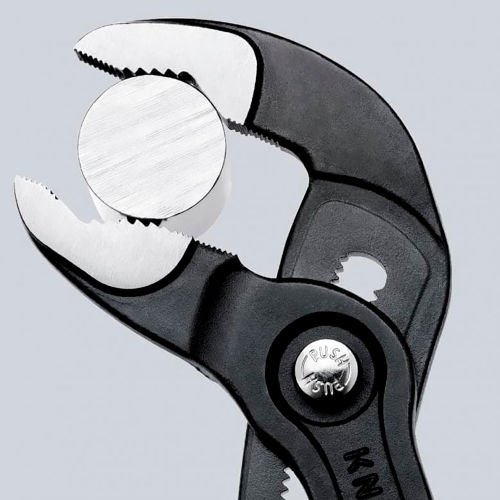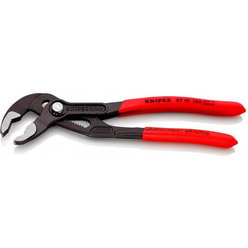 Push the button for adjustment on the workpieceFine adjustment for optimum adaptation to different sizes of workpieces and a comfortable handle widthSelf-locking on pipes and nuts: no slipping on the workpiece and low hand force requiredGripping surfaces with special hardened teeth, teeth hardness approx. 61 HRC: high wear resistance and stable grippingBox-joint design for high stability due to double guideReliable catching of the hinge bolt: no unintentional shiftingPinch guard prevents operators' fingers being pinchedChrome vanadium electric steel, forged, multi stage oil-hardenedCompact high-tech water pump pliers Grip quickly, adjust finely The Knipex 87 01 180 Cobra with a length of 180 mm is one of the medium-sized models of Cobra water pump pliers from Knipex. The benefits of working with these water pump pliers are plain to see. They are compact, light and stable, can be positioned on the component quickly and are self-locking, e.g. on pipes and nuts.Due to its compact size, it is particularly suitable for work in confined spaces. Despite this, it achieves a gripping capacity for pipes with a diameter of up to 1 inches or 42 mm and for nuts up to a wrench opening of 36 mm.For pipes, nuts, sleeves, for various kinds of components: the professional user applies the Knipex Cobra quickly and accurately with just one hand movement. The spring-loaded hinge bolt locks securely into place without adjusting inadvertently. Thanks to the 18-fold fine adjustment, the Knipex Cobra 87 01 180 can be ideally adjusted to different sizes of the component. This fine adjustment also ensures that the user is able to find a hand-friendly gripping position for every grip width. Tough and strong The Knipex Cobra is further stabilized by the box joint design. Unlike pliers with mounted joints, no tilting forces arise when under strain. The handles stabilize each other in the joint. Self-locking mechanism ensures a high degree of efficiency The Knipex Cobra clamps onto the component securely by itself thanks to the jaw geometry developed by Knipex. This means the user can put all energy into the desired movement without pressing the pliers handle together and thus without energy loss: round components can be turned, bolted connections tightened and released. Knipex Cobra: several manufacturing steps for high tool quality We forge the Knipex Cobra from chrome vanadium steel, and use a multiple stage hardening process to give it the ideal balance between hardness and toughness. This makes it extremely durable. To achieve a lasting secure "bite" on the work component, we use high-frequency current to bring the gripping teeth to a hardness of approx. 61 HRC.Professional users expect a tool quality that will last for many hard years of work. We develop and manufacture our pliers for the most demanding users imaginable: for craftsmen. Every pair of pliers from Knipex is manufactured to the highest standards using the best materials. A purchase for many years of use during assembly work, on the building site, in production and in the workshop.