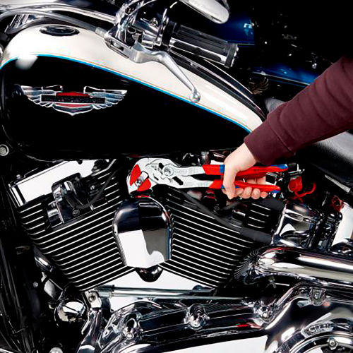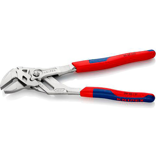 Pliers and wrench in a single tool The Knipex pliers wrench 86 05 250 for classic applications such as plumbing The pliers wrench combines many functions: It replaces an entire set of wrenches in metric and imperial sizes, can be adjusted very quickly and directly on the workpiece at the touch of a button, as well as handling all gripping widths up to 52 mm or 2 inches thanks to infinite adjustment. The joint pin engages securely, preventing unintentional shifting. The smooth gripping jaws are parallel to each other and grip the workpiece without damaging edges or sensitive surfaces work directly on chrome! The Knipex pliers wrench. 10x reinforcement of hand force: The excellent mechanism of the pliers key strengthens the applied hand force by 10 times. Work pieces hold it securely like a vice. Even flat objects can be grabbed and processed easily thanks to the high pressing force and the parallel jaws. Laser-cut size scale The redesigned KNIPEX pliers wrench features two laser-cut scales: metric on the front, imperial on the back. This means that you can set the gripping capacity in advance for workpieces that are more difficult to reach (similar to illustration). Features: Screws, grips, holds, bends and pressesReplaces the need for sets of metric and imperial spannersSmooth jaws for damage free installation of plated fittings - working directly on chrome!Also excellent for gripping, holding, pressing and bending workpiecesZero backlash jaw pressure prevents damage to edges of sensitive componentsFast adjustment by pushing a button directly on the workpieceNo unintentional shift of the gripping jaws and no slipping of the jointParallel jaws give a more solid grip; its design allows flexible adjustment of all widths up to the specified maximum sizeThe ratchet type principle allows quick and easy tightening and release of all bolted connectionsLever transmission greater than 10 : 1 for strong gripping powerChrome vanadium electric steel, forged, oil-hardened.