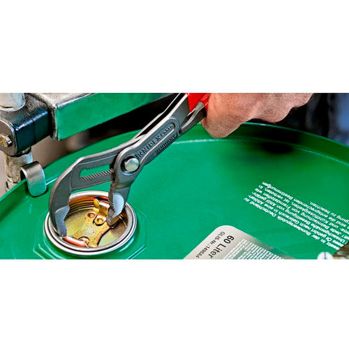 Push the button for adjustment on the workpieceFine adjustment for optimum adaptation to different sizes of workpieces and a comfortable handle widthSelf-locking on pipes and nuts: no slipping on the workpiece and low hand force requiredGripping surfaces with special hardened teeth, teeth hardness approx. 61 HRC: high wear resistance and stable grippingBox-joint design for high stability due to double guideReliable catching of the hinge bolt: no unintentional shiftingPinch guard prevents operators' fingers being pinchedChrome vanadium electric steel, forged, multi stage oil-hardenedThe high-tech water pump pliers Grip quickly, adjust finely The benefits of working with the Knipex Cobra are plain to see: these water pump pliers are light and stable, can be adjusted on the component quickly at the touch of a button and are self-locking on pipes and nuts.For pipes, nuts, sleeves, for various kinds of components: the professional user applies the Knipex Cobra quickly and accurately with just one hand movement. The spring-loaded hinge bolt locks securely into place without adjusting inadvertently. Thanks to the 25-fold fine adjustment, the Cobra can be ideally adjusted to different sizes of the component. This fine adjustment also makes sure that the distance to the handles remains hand-friendly for every grip width. Tough and strong The Knipex Cobra is further stabilized by the box joint design. Unlike pliers with mounted joints, no tilting forces arise when under strain. The handles stabilize each other in the joint. Self-locking mechanism ensures a high degree of efficiency The Knipex Cobra clamps onto the component securely by itself thanks to the jaw geometry developed by Knipex. This means the user can put all energy into the desired movement without pressing the pliers handle together and thus without energy loss: round components can be turned, bolted connections tightened and released. Knipex Cobra: several manufacturing steps for high tool quality We forge the Knipex Cobra from chrome vanadium steel, and use a multiple stage hardening process to give it the ideal balance between hardness and toughness. This makes it extremely durable. To achieve a lasting secure "bite" on the work component, we use high-frequency current to bring the gripping teeth to a hardness of approx. 61 HRC.Professional users expect a tool quality that will last for many hard years of work. We develop and manufacture our pliers for the most demanding users imaginable: for craftsmen. Every pair of pliers from Knipex is manufactured to the highest standards using the best materials. A purchase for many years of use during assembly work, on the building site, in production and in the workshop.