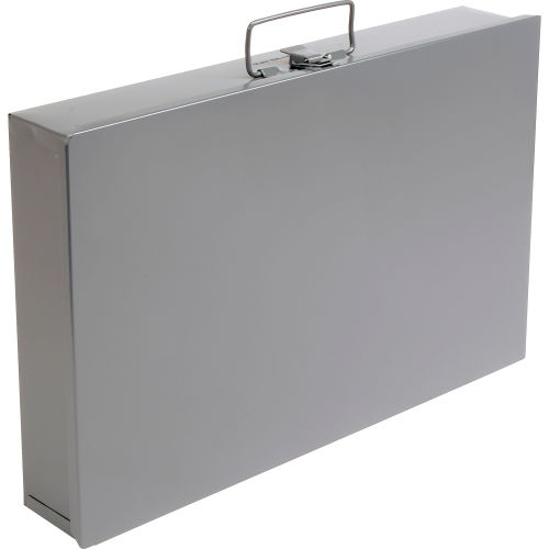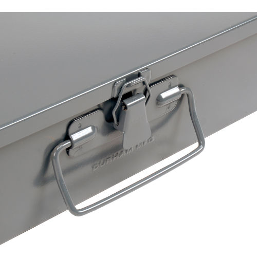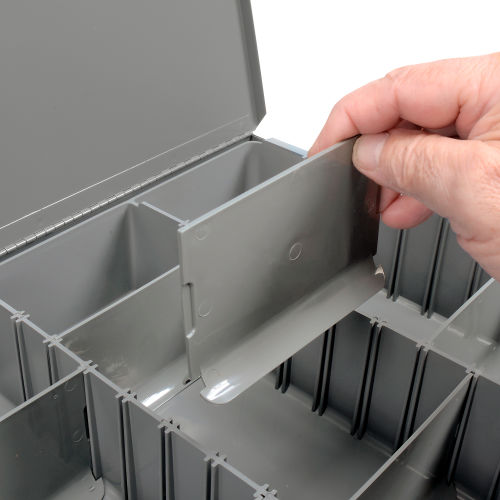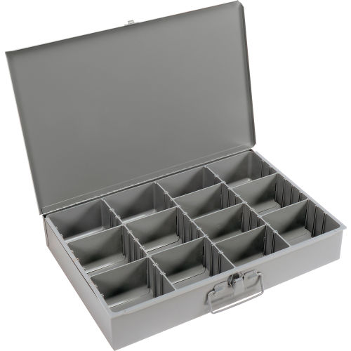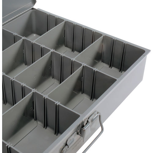 Compartment storage boxes separate items to provide organized storage. Compartment boxes are made with prime cold rolled steel for strength that lasts. Storage boxes include high impact styrene inserts to separate container into compartments. Adjustable Compartment Boxes include 4 fixed vertical compartments and 9 removable dividers that adjust on 1" centers for customizable compartment sizes. Each compartment has a scooped bottom for easy parts removal. Lid features full length piano hinges for rigidity. Positive locking pull-down catch keeps lid tightly closed to secure contents in compartment. Storage boxes measure 18"W x 12"D x 3"H overall. Gray powder coat finish. - Pkg Qty 4.
