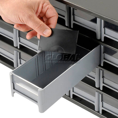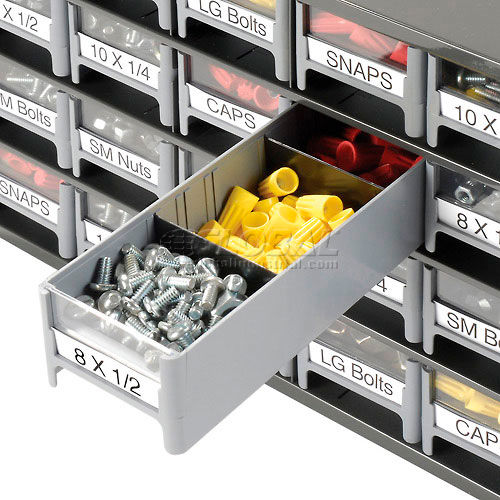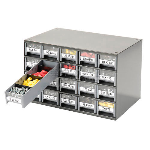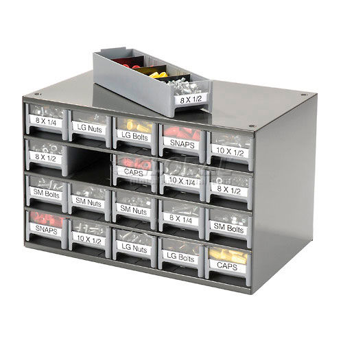 Akro-Mils Steel Small Parts Storage Cabinet - 17"W x 11"D x 11"H w/ 20 Gray Drawers - 19320 This modular 20 multi-drawer steel frame cabinet features galvannealed steel frame with a gray powder coat finish, make it rust proof, chip proof and scratch resistant. High impact styrene scoop bottom drawers with clear fronts and molded in label holder. Overall cabinet size is 17"W x 11"D x 11"H. Nesting "feet" for stable stacking. Includes two dividers and one label per drawer.