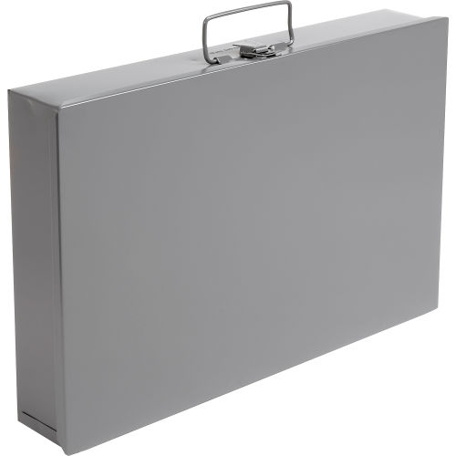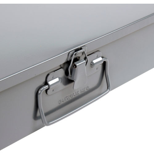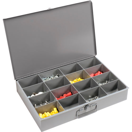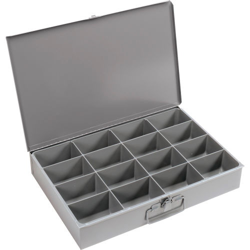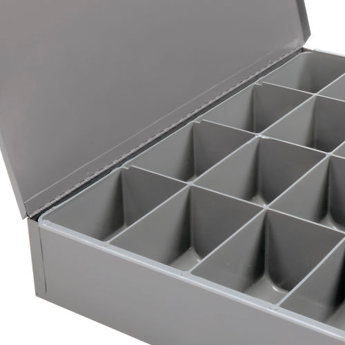 Durham Steel Scoop Compartment Box 113-95 - 16 Compartments 18 x 12 x 3 Compartment storage boxes separate items to provide organized storage. Compartment boxes are made with prime cold rolled steel for strength that lasts. Storage boxes include high impact styrene inserts to separate container into compartments. Each compartment has a scooped bottom for easy parts removal. Lid features full length piano hinges for rigidity. Positive locking pull-down catch keeps lid tightly closed to secure contents in compartment. Storage boxes measure 18"W x 12"D x 3"H overall. Gray powder coat finish. - Pkg Qty 4.