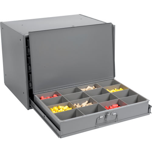 Durham Steel Compartment Box Rack 20 x 15-3/4 x 15 with 4 of 16-Compartment Steel Boxes The Large Compartment Box Slide Rack is constructed of prime cold rolled steel, includes 4 of 16 compartment steel compartment boxes. Ideal for organizing and storing small parts. Large Compartment Box Slide Rack (#303-95) Sturdy construction using prime cold-rolled steel. Each sliding cradle holds up to 40 lbs. Easy glide slides allow boxes to move in and out smoothly. Center braces on sliding cradles provide extra rigidity. Reinforced rack keeps boxes level. Boxes can be easily removed for transport to work areas. Durable gray powder coat finish. Rack dimensions 20"L x 15-3/4"W x 15"H. Steel Scoop Compartment Box (#113-95) with 16 compartment separate items to provide organized storage. The box is made with prime cold rolled steel for strength that lasts. Storage boxes include high impact styrene inserts to separate container into compartments. Each compartment has a scooped bottom for easy parts removal. Lid features full length piano hinges for rigidity. Positive locking pull-down catch keeps lid tightly closed to secure contents in compartment. Storage boxes measure 18"L x 12"W x 3"H overall. Gray powder coat finish.