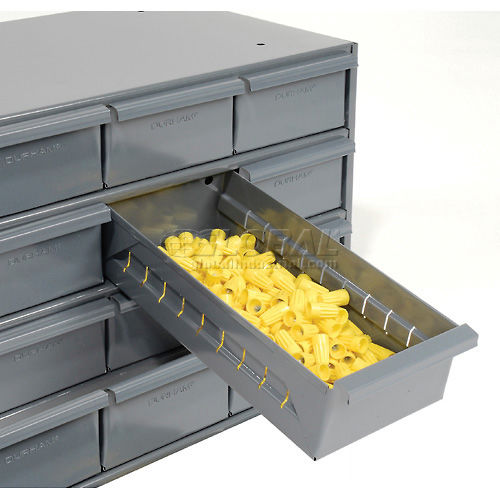 Sturdy Steel Parts Cabinet Storage cabinets feature balanced, no-drag drawers with newly designed pulls and extra heavy construction. Drawers have 2 dividers which may be adjusted on 1" increments to provide desired size compartmentalization. Gray powder coat finish.