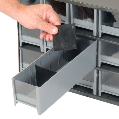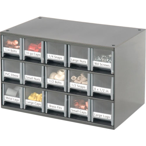 Akro-Mils Steel Small Parts Storage Cabinet - 17"W x 11"D x 11"H w/ 15 Gray Drawers - 19715 This modular 15 multi-drawer steel frame cabinet features galvannealed steel frame with a gray powder coat finish, make it rust proof, chip proof and scratch resistant. High impact styrene scoop bottom drawers with clear fronts and molded in label holder. Overall cabinet size is 17"W x 11"D x 11"H. Nesting "feet" for stable stacking. Includes two dividers and one label per drawer.