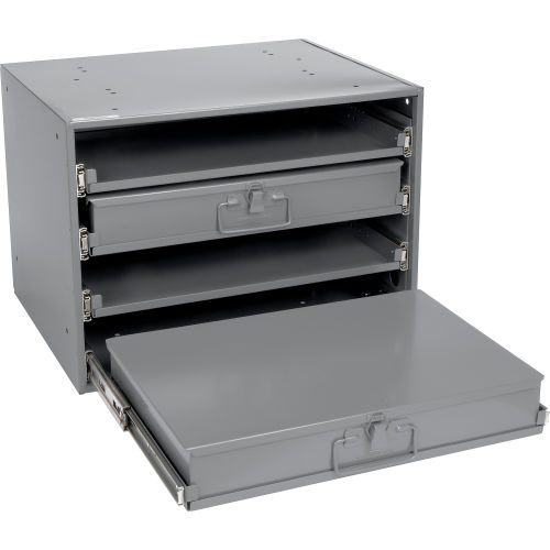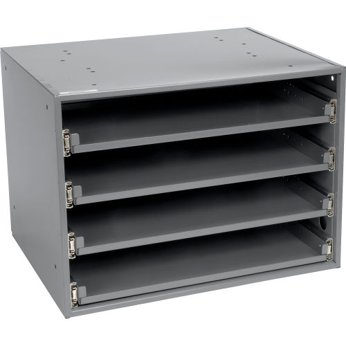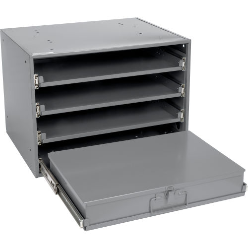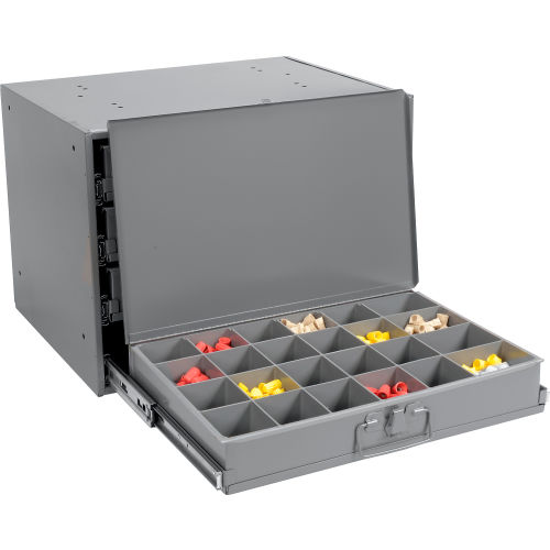 Durham Steel Compartment Box Rack Heavy Duty Bearing 20 x 15-3/4 x 15 with 4 of 24-Compartment Steel Boxes The Heavy Duty Bearing Compartment Box Slide Rack is constructed of prime cold rolled steel, includes 4 steel compartment boxes. Ideal for organizing and storing small parts. Large Heavy Duty Bearing Box Slide Rack (#303B-15.75-95) Sturdy construction using prime cold-rolled steel. Each sliding cradle holds up to 75 lbs. Cradle extends beyond the opening of the unit when in the open position reducing the chance of drawer covers closing when not intended. Positive closure feature keeps trays from sliding out unintentionally. Compartment boxes can be easily removed for transport to work areas Punched holes for easy installation of locking hinge (locking hinge not included). Durable gray powder coat finish. Rack dimensions 20"L x 15-3/4"W x 15"H Steel Scoop Compartment Box (#102-95) with 24 compartment separate items to provide organized storage. The box is made with prime cold rolled steel for strength that lasts. Storage boxes include high impact styrene inserts to separate container into compartments. Each compartment has a scooped bottom for easy parts removal. Lid features full length piano hinges for rigidity. Positive locking pull-down catch keeps lid tightly closed to secure contents in compartment. Storage boxes measure 18"W x 12"D x 3"H overall. Gray powder coat finish.
