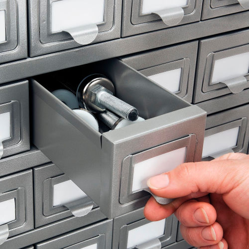 Global MULTI-DRAWER CABINET Welded steel construction. Smooth gliding 3"W x 8"D x 2-1/2"H drawers with drawer stops...prevents accidental pull-out. Sturdy drawer pull with label holder and labels. Fully assembled...ready for instant use. Gray enamel finish.