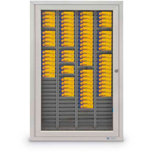 This secure system ensures cards are always in the correct place, eliminating loss or misuse. The clear acrylic window allows cards to always be in view, while also securely enclosed. Cabinets are constructed of Anodized Aluminum with a full-length piano hinge door and a traditional frame. Cabinets can be wall-mounted or mounted in a solid-steel frame stand with 3" swivel casters. Choose from single door cabinets with either 60 or 120 badge slots or a double door design with 240 badge slots. Slot size is 3-3/4" x 1-3/4".