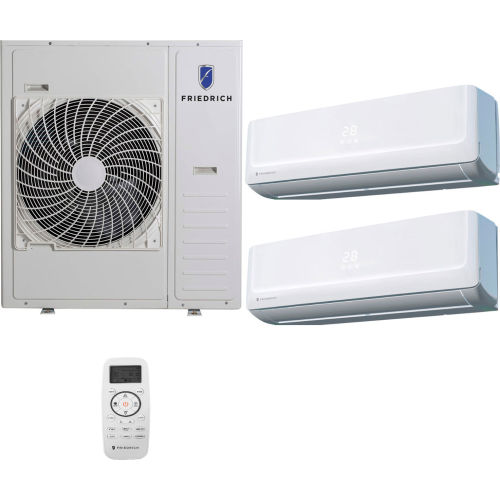 No ductwork No problem. Incredibly quiet, sleek and energy-efficient, ductless split systems are the smart way to cool rooms without ductwork even those without windows or exterior walls. The entire line utilizes Precision Inverter Technology which allows systems to reach the desired temperature faster, maintain it more accurately, and reduce energy costs, which is especially beneficial in multizone systems where room temperature set points vary and some indoor units may be turned off in unoccupied rooms. It has SEER ratings up to 25.0. Friedrich's high efficiency multi zone heat pumps feature comfort and convenience all year round. In heating mode these systems use approximately 1/4 of the energy required by electric heat. Now Featuring FastPro design: The Easiest Ductless to Install, Clean & Service On typical ductless indoor units, accessing the indoor coils is extremely difficult and takes so much time that a thorough cleaning may be next to impossible. Access to piping, wire terminal blocks, the fan and fan components is also a challenge. Friedrich FastPro was designed with the HVAC technician in mind. In a few easy steps that can be performed in minutes, the entire blower wheel assembly can be removed for easier, faster cleaning and service. Also, you'll have easy access to the terminal blocks. FastPro will save you hours on the jobsite. Key Features: Precision Inverter technology (variable speed compressor)Fast Pro blower wheel assembly for the fastest access for maintenance of any wall-mounted ductless split systemsSoft start compressorBLDC motorHigh efficiency for low operating costDiamonBlue Advanced Corrosion Protection Auto Clean indoor coilCooling/Heating/Fan/Auto modeSurge Cool/HeatNatural air flowUltra quiet operationSleep modeAuto restartAuto changeover24-hour on/off timerHidden display (only visible during operation)Limited Warranty of 5 Years for Parts and 7 Years for CompressorOperates in extreme conditions Low ambient operation down to 5 F (Cooling mode)Low ambient operation down to -4 F (Heating mode)Low temperature compressor start-up protection.