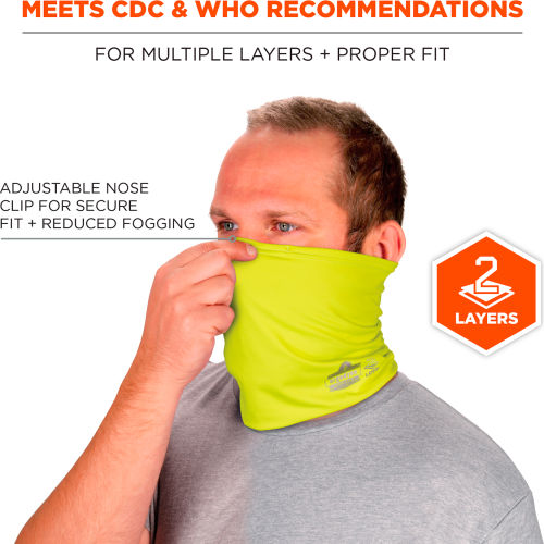 The Chill-Its 6489 2-Layer Cooling Multi-Band meets CDC and WHO recommendations for multiple layers of protection while also shielding the face and neck from sun, dust and flying debris. When worn as a face covering, a nose clip along the top makes for a comfortable and secure fit while also reducing eyewear fogging. Evaporative technology can be easily activated with water for immediate cooling relief. This neck tube is rated to UPF 50+ for protection against the sun's harmful UV rays and features an anti-odor treatment for fresh all-day wear. A reflective accent enhances visibility in low-light conditions. Ideal for anyone requiring two layers of face protection, particularly those who are working or spending excess time in the heat. Simply wet the cooling headwear to activate instant cooling relief that lasts for hours. When activated, this multi-band is lightweight and refreshing for even the hottest days of the year. Machine wash and hang dry as needed. Features: TWO-LAYER Meets CDC and WHO face mask recommendations for multiple layers of protectionADJUSTABLE NOSE CLIP For secure, comfortable fit and reduced fogging with eyewearINSTANT COOLING RELIEF When wet, cooling is immediate and can last for hoursMOISTURE WICKING When dry, will absorb sweat and wick moisture awaySUN PROTECTION UPF 50+ protection from harmful UV raysREFLECTIVE ACCENTS Offers visibility in low-light situationsANTI-ODOR TREATMENT For long-lasting freshnessMULTIPLE COLORS Available in Black, Hi-Vis Lime, Hi-Vis Orange and BlueTHREE SIZES Available in S/M, L/XL, 2XL/3XLMACHINE WASHABLE.