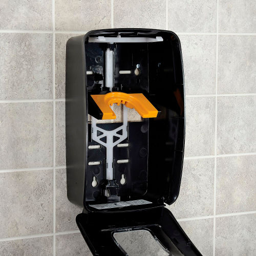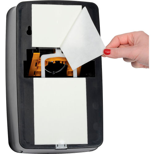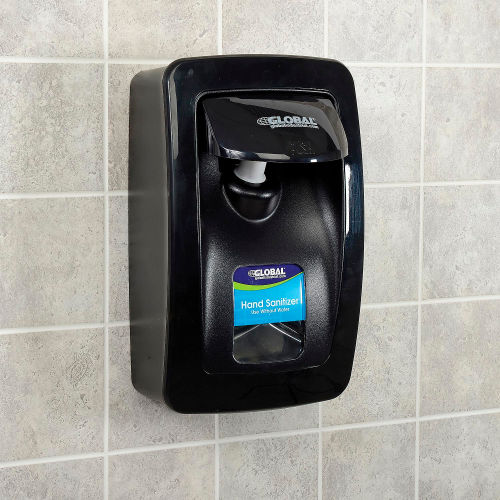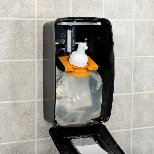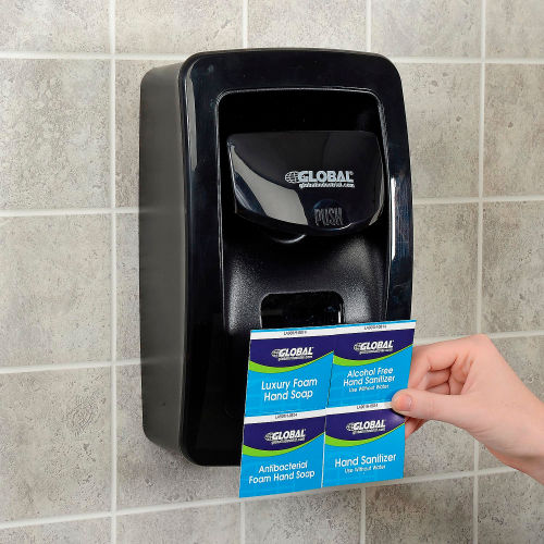 Global Industrial Manual Dispensers are ideal for use in offices, schools, warehouses, food service facilities, manufacturing, and more. Durable plastic construction with no metal parts, making it ideal for wet or dry conditions. Large site window allows for easy refill, and can be used to display easy-to-slide product identification window cards (included). Top dispensing technology reduces risk of leaking valves. Ergonomic push pad. High 1250mL capacity dispenser helps reduce maintenance, and dispenses only 0.75mL per activation to reduce waste. ADA compliant with a secured locking option. Mounts easily to wall with adhesive backing or mounting hardware (included). Black color finish. For use with Global Industrial Hand Soap & Sanitizer Refills Only (sold separately). Note on Refill Installation: place bottom of the refill pouch in the dispenser first, ensuring that the entire pouch is tucked into the dispenser, then snap the nozzle into the collar and close the cover.