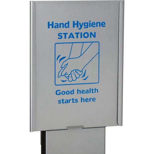 No Touch Floor Stand makes hand sanitizing easy Helps promote clean hands and good health, and is ideal for use in lobbies, hallways, breakrooms, cafeterias and more. Lightweight construction makes floor stand easy to transport and move to other locations. Can be positioned in two dispensing heights - standard 44" height or low 41" height. Features a universal hand hygiene message on the stand, as well as a 6" x 8" message holder to place a customized message (customized message card not included). Easy assembly. For use with Global Hand Soap and Sanitizer Manual and Automatic Dispensers only (sold separately). Matte silver finish. Overall height 56".
