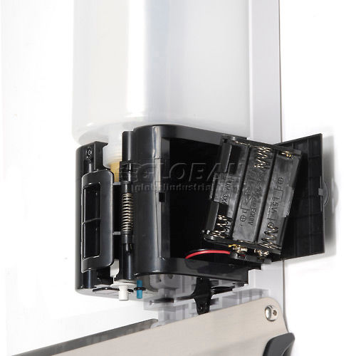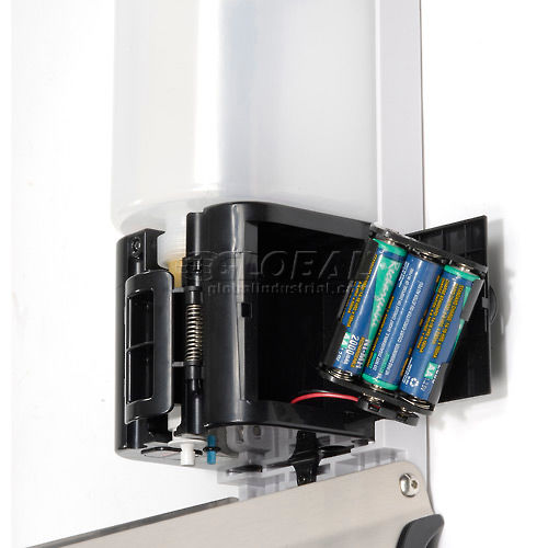 Palmer Fixture Automatic Stainless Steel Soap Dispenser Automatic soap dispenser delivers measured amounts of soap to prevent waste and improve sanitation. Soap dispenser automatically activates with user's motion, operates quietly, and automatically shuts off when hands are removed from sensor range. This automatic soap dispenser is battery operated, and battery chambers are key locked. The unit operates on 4 "AA" batteries (sold separately) for up to 15,000 cycles. Measures 4-1/2"W x 4-1/2"D x 10-3/4"H.