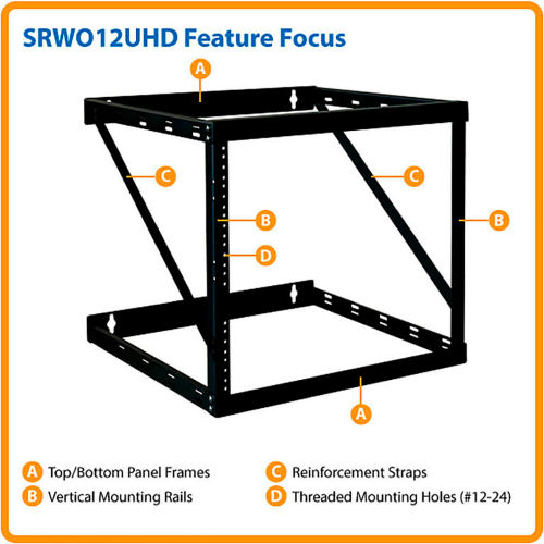 The SRWO12UHD SmartRack 12U Heavy-Duty Flat-Pack Low-Profile Switch-Depth Wall-Mount 2-Post Open Frame Rack stores and organizes EIA-standard 19-inch rack equipment compatible with 2-post mounting in network wiring closets, back offices and other secure areas with limited floor space where a locked enclosure is not required. Constructed from heavy-duty steel with a durable black powder-coated finish, the rack has a maximum load capacity of 200 pounds. The open frame design allows unrestricted access for installing, configuring and servicing equipment and cabling. The rack is simple to assemble and mount to the wall. Threaded 12-24 mounting holes and numbered rack spaces make equipment installation easy. The vertical mounting rails accommodate equipment up to 18 inches deep, such as network switches and patch panels. Assembly and equipment-mounting hardware is included. Features: Maximum load capacity of 200 lb.Allows easy access to equipment and cablingStores 12U of 19 in. rack equipment up to 18 in. deepSimple to assemble and mountAssembly and equipment-mounting hardware included.