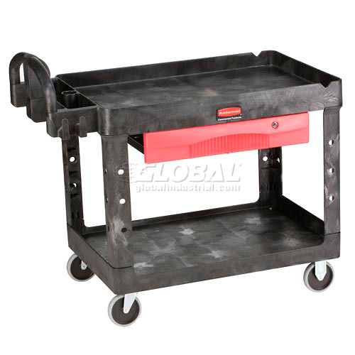 Keeps valuables safe. Fits Rubbermaid Tray Shelf Plastic Service Carts measuring 44"L x 25"W (Model Numbers 241559 and 241561) and 54"L x 25"W (Model Numbers 241562 and 241563). Drawer measures 25"L x 17"W x 4"H. 1 Year Limited Warranty.