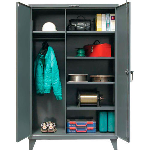 Strong Hold Heavy Duty Wardrobe Storage Cabinet - 48x24x78 - 46-W-245 EXTRA HEAVY DUTY MAINTENANCE STORAGE CABINET "Battleship" construction for lifetime durability! Superior strength 12-gauge all-welded steel body construction provides maximum protection. Solid Front Cabinet has dual doors that swing open 180 and feature secure brass hinge pins and cast bronze handles. 14 gauge shelves adjust on 2" centers. Padlockable 3-point latching system for security. Electrostatic dark gray enamel finish. 6" legs. Shipped fully welded, ready to use.