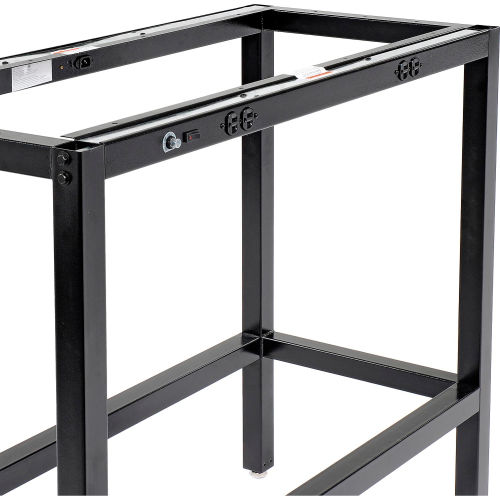 Interion Bar Height Computer Workstations combine durability with on-the-go productivity. 42" height provides comfort for standing and a foot rest for sitting when using a standard stool. Durability comes from a heavy duty steel frame supporting a x Shop-top bench top that is 1-1/2" thick. The top has clear lumber edge bands which are faced on two sides with 3/8" thick super hard 62 lb. high-density particleboard sealed with a catalyzed finish for liquid resistance. This Workstation from Interion By Global Industrial has a super strong MDF core. Protects against static build up and wont warp or split. Productivity comes from 8 AC power outlets - two pairs on each of the long sides of the table.