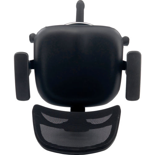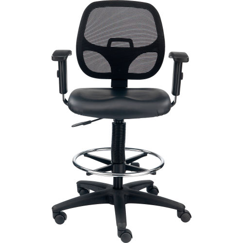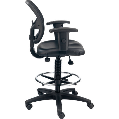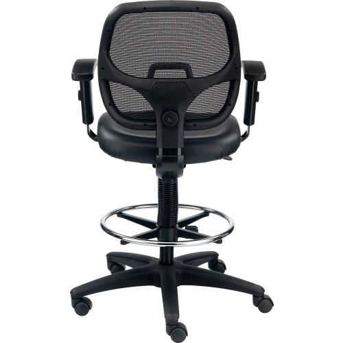 Drafting Stool, Black, Vinyl This Mesh Back Drafting Stool is perfect for Office, Warehouse, Training Area and More. Ergonomic design with nylon mesh back conforms to body for cool, ventilated and supportive comfort. 16-1/2"H x 17-3/4"W plastic trim backrest ensures long lasting durability. Drafting stool built-in lumbar support provides added back comfort. Height adjustable T-arms align arms and wrists correctly for data entry work. Arms also adjust side to side. Polypropylene five-blade base with 2" dual-wheel carpet casters provide easy mobility. Easy assembly. 1 Year Limited Warranty.