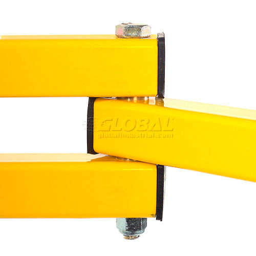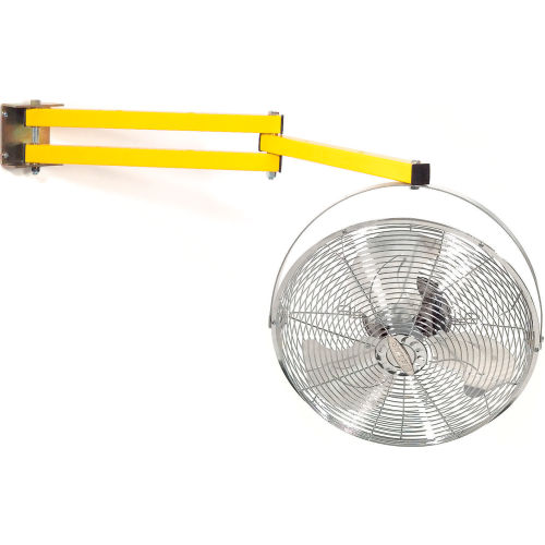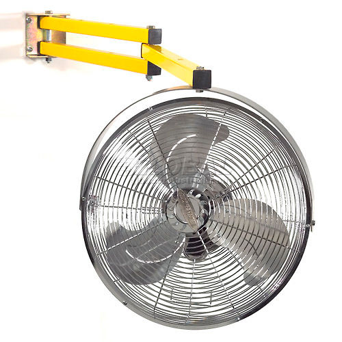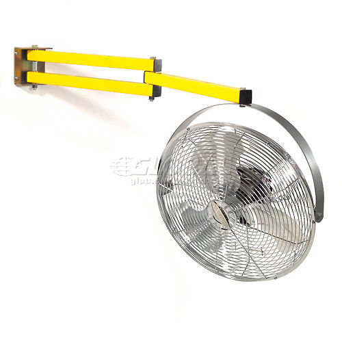 Cool hard-to-reach loading and unloading areas. Durable twin-strut steel arm helps prevent sagging is hinged to extend easily and fold compactly. Adjustable friction pivot maintains position. Heavy-duty 115V grounded cord. Meets OSHA requirements. Long-lasting baked enamel finish. High velocity 18" diameter fan moves 4,000 CFM. Two speed 3.2 amp permanently lubricated motor. Aluminum blades improve air circulation and are enclosed by a chrome-plated guard. Extends to a reach. Mounting bracket Details: The mounting bracket size is 5-1/4" x 5"The centre to centre hole pattern is 3-3/8" x 4-1/4"The 4 mounting holes are 7/16" diameter.