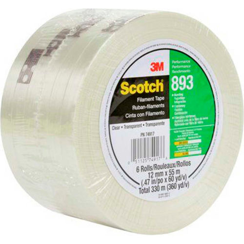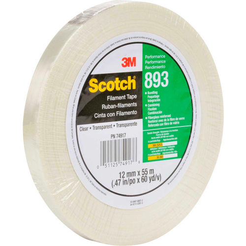 Scotch 893 Filament Tape 1/2" x 60 Yds. 6 Mil Clear - 72 Rolls/Case Scotch Filament Tape 893 provides an excellent solution for metal splicing, rebar and pipe bundling or reinforcing large bulk containers. This filament-reinforced tape has a clear, polypropylene backing that resists abrasion, moisture, scuffing and breaks, even if nicked or punctured. With an increased tensile strength, this tape is ideal for a variety of reinforcing, strapping and bundling applications. This sturdy tape dispenses easily without curling for easy application and its multi-layer synthetic-rubber adhesive system prevents delamination. The synthetic adhesive bonds well to a variety of surfaces commonly used in packaging, such as corrugated cardboard, fiberboard, plastic and metals. Recommended applications include high strength reinforcing, heavy duty strapping, sealing and palletizing cartons, securing boxes, metal splicing, coil tabbing, metal and pipe bundling. Details: High-strength, filament-reinforced tape resists nicks, abrasion and moistureSynthetic rubber adhesive bonds easily to most fiberboard, plastics and metal surfacesGlass yarn filaments add strength for box closing, bundling and moreAble to withstand rough shipping and handling conditions - Pkg Qty 72.