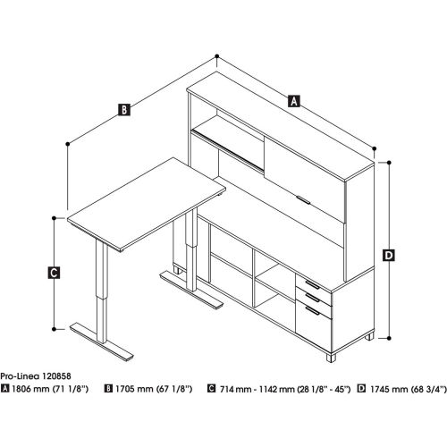 Pro-Linea has all the elements to create a modern and refined work environment. The clean lines of this collection bring a fresh look without compromising functionality and durability. The Credenza and the table are made of a durable 1" commercial grade work surface with melamine finish that resist scratches, stains and wear. The electric mechanism allows you to quickly and quietly adjust the height of the table from 28" to 45". The control button is located on the front edge of the work surface for an easy access. Voltage: 110V. The credenza features metal legs, two utility drawers, one file drawer with letter/legal filing system and three shelves, two of which are adjustable. The drawers are on ball-bearing slides for a smooth and quiet operation. The hutch for credenza offers large storage spaces and a sliding door. The credenza, the hutch and the height adjustable table meet or exceed ANSI/BIFMA performance standards. The station is fully reversible. Overall dimensions: 71.1" x 67.1" x 68.8". Credenza: 71.1" x 19.5" x 28.4". Height adjustable table: 47.6" x 24" x 28" to 45".