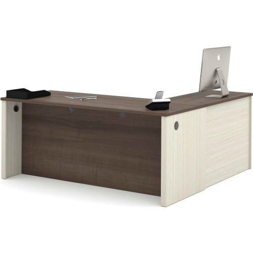 Bestar L-Shaped Workstation with Pedestal - White Choc/Antigua - Prestige Series Prestige is a timeless modular collection that will adapt to your needs, over time. With its wide range of products, it is ideal for every type of office. The desk is made of a durable 1" commercial grade work surface with melamine finish that resist scratches, stains and wear. It features an impact resistant thick PVC edge, a modesty panel and classic moldings. Grommets are available on the desk for efficient wire management. The executive desk and the return table meet or exceed ANSI/BIFMA performance standards. The pedestal offers two utility drawers and one file drawer with letter/legal filing system. One lock secures bottom two drawers. The drawers and the keyboard shelf are on ball-bearing slides for a smooth and quiet operation. The station is fully reversible.