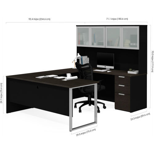 Bestar U-Desk with Frosted Glass Door Hutch - Deep Gray and Black - Pro-Concept Plus Series