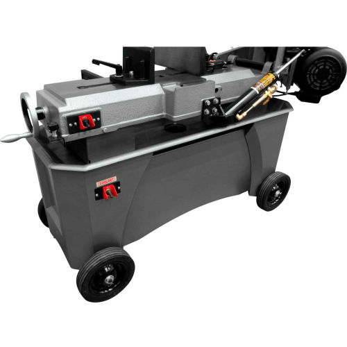 The JET HVBS-712 Horizontal/Vertical Metalworking Bandsaw has everything any operator needs to tackle even the toughest job. JET increased the width and height of the stand and added new features that exceed expectations. The HVBS-712 is another innovative JET product packed with features you've come to expect. Features: 9-7/16" x 10" work table in the vertical positionRapid action vise miters to 45 Improved Height and width of stand with built-in storage cabinet and chip trayAdjustable material stop for repeatabilityCSA/CUS : Following strict guidelines and electrical requirements, this JET Saw is CSA/CUS certifiedBlade drive is a belt to sealed, hardened and ground gear drive systemBlade wheels are made from flanged cast iron for increased durabilityAuto shut-off after cutAdjustable ball bearing blade guidesCast mounted adjustable hydraulic downfeedComplete coolant systemFour 8" rubber wheels for ease of movement3/4" Bi-Metal blade.