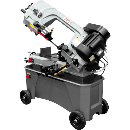 The JET HVBS-712D Deluxe Horizontal/Vertical Metalworking Bandsaw has everything any operator needs to tackle even the toughest job. Increased the width and height of the stand and added new features that exceed expectations. The HVBS-712D is another innovative JET product packed with features you've come to expect. Features: Large 10" x 12" infeed table assembly extends the support area and can be used in either horizontal or vertical positionsMulti-position blade guides enhance use in vertical position by increasing the throat capacity from 4" to 8" and creates a safer working positionTool-less quick lock vise with preset mitering positions at 15 , 30 & 45 Improved Height and width of stand with built-in storage cabinet and chip trayMicro adjustable tool-less material stop for accurate set-up and repeatabilityCSA/CUS : Following strict guidelines and electrical requirements, this JET Saw is CSA/CUS certifiedBlade drive is a belt to sealed, hardened and ground gear drive systemBlade wheels are made from flanged cast iron for increased durabilityAuto shut-off after cutAdjustable ball bearing blade guidesCast mounted adjustable hydraulic downfeedComplete coolant systemFour 8" rubber wheels for ease of movement3/4" Bi-Metal blade.