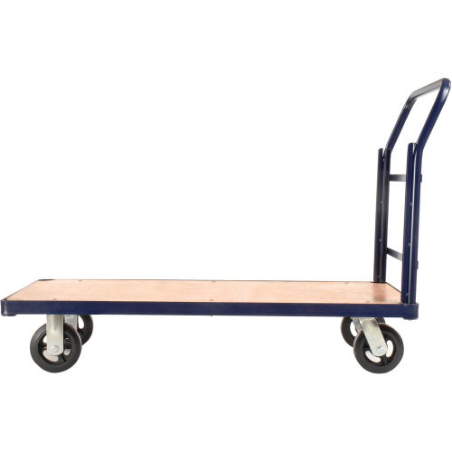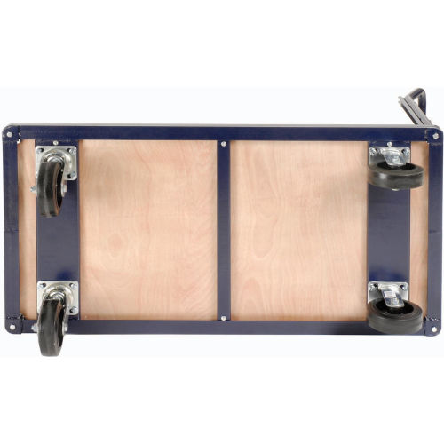 Euro Style Truck Flat Deck 60 x 30 2400 Lb. Capacity Transport materials easily and securely. Sturdy 1/8" x 1-1/2" angle iron frame has rounded safety edges and is finished in scratch resistant blue enamel. Rugged 3/4" thick plywood decking with lacquer finish helps reduce noise during transport. Each truck includes two swivel and two rigid casters. Cross-braced 29"H handle. Assembles easily.