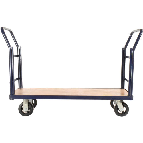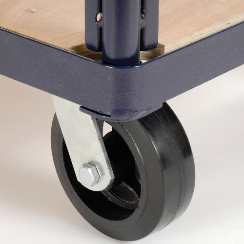 Euro Style Truck with 3 Wood Sides & Deck 60 x 30 2000 Lb. Capacity Transport materials easily and securely. Sturdy 1/8" x 1-1/2" angle iron frame has rounded safety edges and is finished in scratch resistant blue enamel. Rugged 3/4" thick plywood decking with lacquer finish helps reduce noise during transport. Each truck includes two swivel and two rigid casters. Cross-braced 29"H handle. Assembles easily.