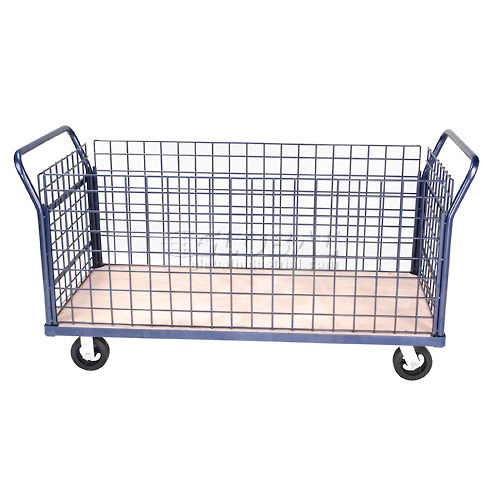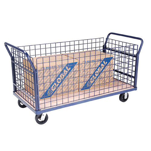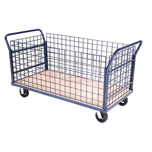 Euro Style Truck with 4 Wire Sides & Wood Deck 60 x 30 2000 Lb. Capacity Transport materials easily and securely. Sturdy 1/8" x 1-1/2" angle iron frame has rounded safety edges and is finished in scratch resistant blue enamel. Rugged 3/4" thick plywood decking with lacquer finish helps reduce noise during transport. Wire panels 23"H with 2-1/4" sq. grids allow for air circulation and inventory control. Each truck includes two swivel and two rigid casters. Cross-braced 29"H handle. Assembles easily.