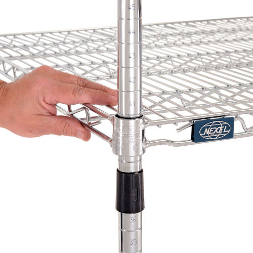 ✓ Simple tool-free assembly ✓ 800 lbs. capacity of evenly distributed weight ✓ Open design allows air and light circulation while minimizing dust accumulation Simplify storage in your facility with our Nexel Chrome Wire Shelving that keeps your items neatly organized, on strong, durable, and adjustable flat-wire shelves. This freestanding wire shelving unit is made of steel construction and is suitable for a variety of dry applications, from retail display to warehouse storage. Each wire shelf adjusts in 1" increments and is reinforced with welded surface ribs for added strength to support large quantities of items. Additionally, this chrome wire shelving starter unit can be connected with optional add-on shelving units to expand the quantity of storage rows. Casters or additional shelves (both sold separately) can add mobility and levels. NSF approved. 1-Year Limited Warranty. Includes 4 posts with levelers, 4 shelves, and snap-on sleeves All shelves are adjustable on 1" increments 48"W x 30"D x 54"H.