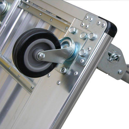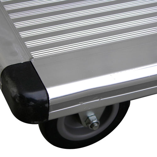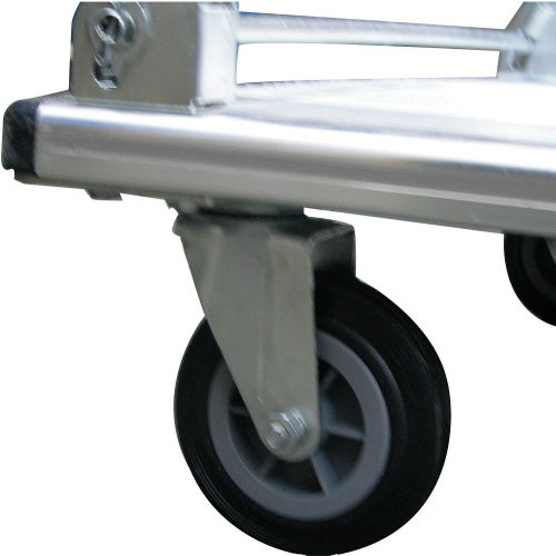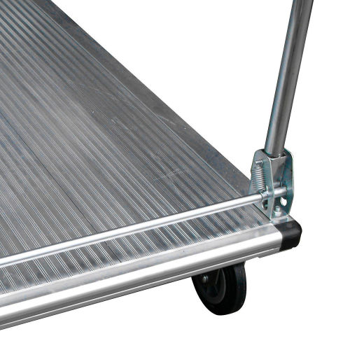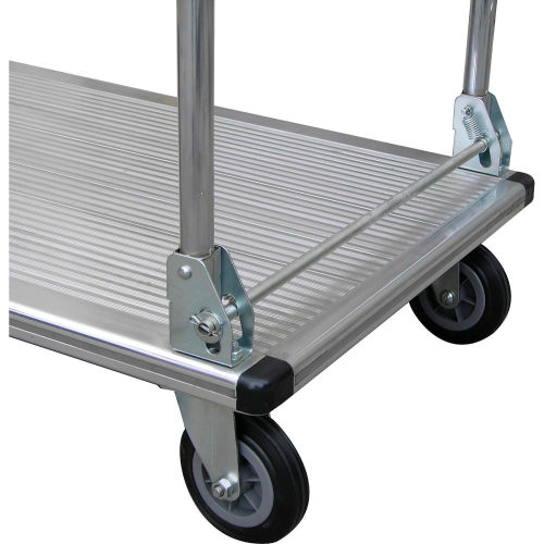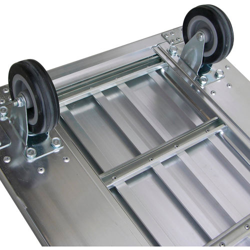 Folding Aluminum Platform Truck 29 x 19 400 Lb. Capacity - 241419 Comfortable, ergonomically designed handle folds down for compact storage. Corrosion resistant deck with ribbed surface to help retain cargo. Integral vinyl deck bumpers protect doorways and walls. Lightweight, quiet rolling and maneuvers easily on 2 swivel, 2 rigid 4" rubber casters. Note: Usable Deck Length = 26-1/2".