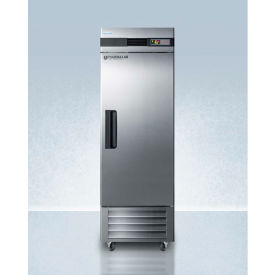 Accucold ARS23ML Pharma-Lab Performance Series Upright Pharmacy Refrigerator, Solid Door, 23 Cu.Ft. Accucold's Pharma-Lab Performance Series features reach-in refrigerators and matching freezers designed and purpose-built to meet the demanding needs for pharmacy, medication, vaccine, laboratory, and life science applications. The ARS23ML is a 23 cu.ft. all-refrigerator with an adjustable control range from +2 to +10 C. The microprocessor temperature controller features a large digital LED display viewable in Celsius or Fahrenheit, making it easy for staff to manage and monitor the temperature. The unit is equipped with an air sensor for rapid control response and a product sensor for a more accurate reading of the interior, including a display of the min/max temperature in 15 minute increments The audible and visual temperature alarm sounds if the unit rises or falls above a user-set range. Additional alarms include a power failure alert, door open alarm, and a condenser cleaning reminder. Inside, the ARS23ML utilizes adjustable cycle defrost operation to avoid temperature spikes, with a top-mounted forced air cooling system to ensure rapid temperature recovery. Four vinyl-coated wire shelves on cantilevered clips allow you to accommodate virtually any sized item. The LED lighting displays automatically when the door is open, providing a full and energy efficient display. The ARS23ML features a durable stainless steel cabinet and interior, with a sealed back for easier cleanup. We include a set of casters (2 locking) for optional installation. A factory-installed lock offers added security, with two keys included for your facility. Magnetic door gaskets ensure a strong seal. The door is self-closing to help protect contents, but will remain open at 90 for easier loading. Designed with hydrocarbon refrigerant, the ARS23ML provides an energy efficient solution to large capacity storage. This unit is Pyxis, Omnicell, and AcuDose RX compatible and meets NSF-7 commercial standards. For a matching frost-free freezer, see the ARF23ML. A glass door refrigerator version is also available (model ARG23ML).