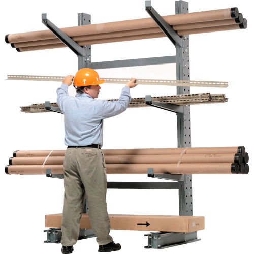 Excellent low-cost storage system store long products with ease. Unobstructed arms afford easy accessibility with no uprights on the aisle to restrict storage. Arms adjust easily on 3" centers. "Pin keeper" device prevents arms from being dislodged during loading and unloading. Easy assembly, no special tools required. Gray enamel finish. Made in the USA. Note: This item is ONLY compatible with Global Industrial 1000 Series Cantilever Racks. Sold As Single Upright.