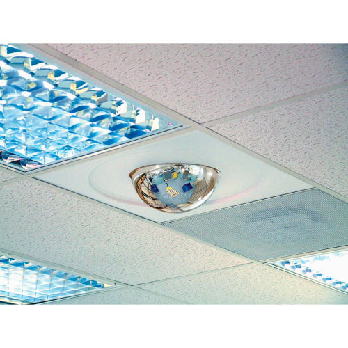 Wide-angle dome mirror provides unobstructed view of blind areas. Helps prevent costly accidents. Assures safety and security. Ideal for hallways, corners, elevators. Bright panoramic image aids personnel supervision, machine monitoring, production and traffic control. Lightweight, unbreakable 1/8'' thick acrylic. Drop-In Suspended Ceiling styles are designed to provide a flush clean appearance by simply replacing a ceiling tile.