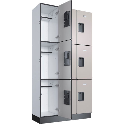 ✓ Lift-up hasp locking mechanism ✓ Carb II-compliant particleboard covered in durable laminate ✓ Durable and moisture-resistant steel base Elevate the look & feel of your locker room or changing room with this unassembled 3-tier/9-door Global Industrial Wood Locker. Wood lockers give any space a natural warmth that presents a more comfortable and welcoming tone than standard metal lockers plus they are also quieter when they close. The body of the locker is made of 0.70" (18mm) thick Carb II-compliant particleboard covered in a durable high-pressure laminate with heavy-duty concealed steel hinges, and a lift-up hasp locking mechanism. What separates this Global Industrial wood locker from the competition is the durable, moisture-resistant steel base. Typical wood lockers carry the wood to the base, which can warp, peel, or buckle when exposed to persistent moisture such as gym or club locker rooms and spas. The steel base on this locker is designed to deliver elegant performance with a long service life. This version comes unassembled in a gray color. Door edges are banded with PVC banding Locker doors are 12.0" wide x 0.70" deep Blank steel ID plates included for customization Each compartment includes a 4-5/8" deep shelf and two sets of double prong hooks Optional color-matched gray end panel, #290630 available separately, to present a finished look Ideal for use in: Clubhouses & country clubs, spas & resorts, fitness centers & gyms, executive suites.