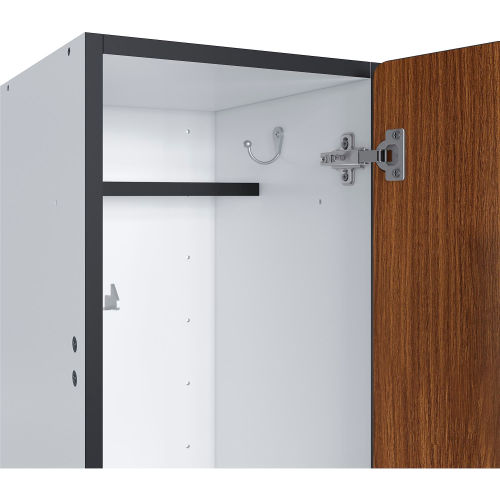 ✓ Lift-up hasp locking mechanism ✓ Carb II-compliant particleboard covered in durable laminate ✓ Durable and moisture-resistant steel base Elevate the look & feel of your locker room or changing room with this unassembled 3-tier/3 -door Global Industrial Wood Locker. Wood lockers give any space a natural warmth that presents a more comfortable and welcoming tone than standard metal lockers plus they are also quieter when they close. The body of the locker is made of 0.70" (18mm) thick Carb II-compliant particleboard covered in a durable high-pressure laminate with heavy-duty concealed steel hinges, and a lift-up hasp locking mechanism. What separates this Global Industrial wood locker from the competition is the durable, moisture-resistant steel base. Typical wood lockers carry the wood to the base, which can warp, peel, or buckle when exposed to persistent moisture such as gym or club locker rooms and spas. The steel base on this locker is designed to deliver elegant performance with a long service life. This version comes unassembled in a cherry wood color. Door edges are banded with PVC banding Locker doors are 12.0" wide x 0.70" deep Blank steel ID plates included for customization Each compartment includes a 4-5/8" deep shelf and two sets of double prong hooks Optional color-matched cherry wood end panel, #290629 available separately, to present a finished look Ideal for use in: Clubhouses & country clubs, spas & resorts, fitness centers & gyms, executive suites.