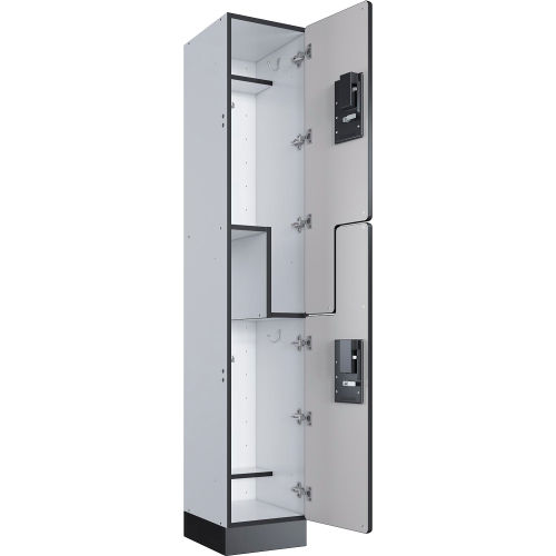 ✓ Lift-up hasp locking mechanism ✓ Carb II-compliant particleboard covered in durable laminate ✓ Durable and moisture-resistant steel base Elevate the look & feel of your locker room or changing room with this fully assembled 2-tier/2-door Global Industrial Wood Locker. Wood lockers give any space a natural warmth that presents a more comfortable and welcoming tone than standard metal lockers plus they are also quieter when they close. The body of the locker is made of 0.70" (18mm) thick Carb II-compliant particleboard covered in a durable high-pressure laminate with heavy-duty concealed steel hinges, and a lift-up hasp locking mechanism. What separates this Global Industrial wood locker from the competition is the durable, moisture-resistant steel base. Typical wood lockers carry the wood to the base, which can warp, peel, or buckle when exposed to persistent moisture such as gym or club locker rooms and spas. The steel base on this locker is designed to deliver elegant performance with a long service life. This version comes fully assembled in a gray color. Door edges are banded with PVC banding Locker doors are 12.0" wide x 0.70" deep Blank steel ID plates included for customization Each compartment includes a 4-5/8" deep shelf and two sets of double prong hooks Optional color-matched gray end panel, #290630 available separately, to present a finished look Ideal for use in: Clubhouses & country clubs, spas & resorts, fitness centers & gyms, executive suites.