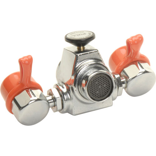 Guardian Equipment Faucet Mount Eye Wash, G1100 For most types of faucets. Aerated outlet heads are mounted 2 1/2" apart and angle forward. Aerated heads deliver a soft flow of water for gentle rinsing action. The angle of the heads help avoid splashing on the counter or the floor. Does not include identification sign.