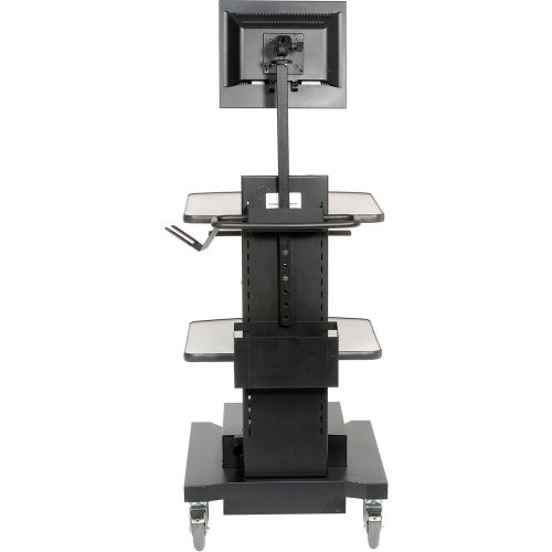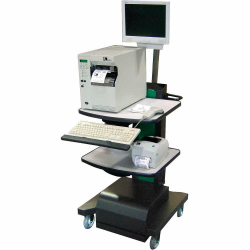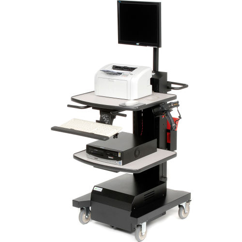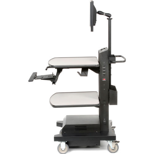 ✓ Able to help process goods directly at the pallet or on the dock. ✓ Efficient and organized system helps to increase the process of receipts. ✓ Mobile casters provide easy and quick relocation. Boost convenience and mobility in your workplace with the Newcastle Systems NB Series Mobile Powered Workstation. This NB Series carts are the workhorse carts of our product line-up. The rugged design that keeps our carts operating on the floor for years with the mobility and flexible configurations that let you transform any legacy process and create measurable efficiencies. With the largest range of accessories, the NB Series can accommodate almost any profile of workstation including those with scales, testing equipment, large monitors, printers and more. Please note that accessories depicted in the gallery images are sold separately. For details and purchase options, please refer to the listing below. Durable weight and compact design. Helps reduce improperly labeled products and inaccurate inventories. Power and run time: Laptop/thin client, LCD, industrial thermal printer & scanner for 8+ hours. Includes: (1) adjustable top shelf, (1) middle shelf, 5" locking casters, front push handles, wastebasket and holder, integrated docking station, built-in power strip, and cord reel holder. Optional Accessories (Sold Separately): Scanner Holder (Model 238542) Heavy-Duty Keyboard and Mouse Tray (Model B2236206) Post Mount Single Monitor Holder (Model B2236199) Laptop/Tablet Holder (Model B1373430) Adjustable CPU Holder (Model B1373429) Binder Holder (Model 238543) Please Note: This mobile powered cart is not recommended for powering a laser printer. To power a laser printer, please check model B2328966 or model B2328965.