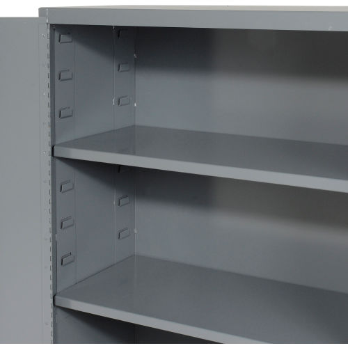 All Welded Heavy Duty Storage Cabinets This heavy duty cabinet has a strong 16-gauge all-welded steel body and 14 gauge box formed steel shelves with 900 lb. capacity that adjust at 4" increments, making them ideal for holding tools, dies, machine parts or supplies. Channel reinforced doors close securely with all welded full-length piano hinges. Chrome key-locking handles. Durable gray powder coat finish. Storage cabinets shipped assembled.