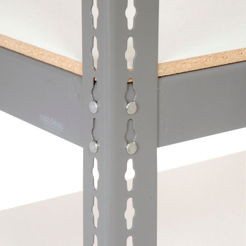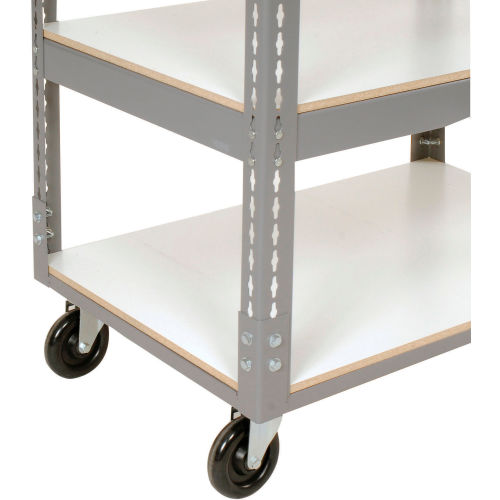 Easy access to items from all sides. Super strong roll formed steel framing with positive interlocking beam and post connection. 2-1/4" x 1-1/2" x 14-gauge uprights. Attractive, bright, easy to clean melamine laminated 1/2" thick particle board shelves are supported by steel beams that "quick adjust" on 1-1/2" increments. Strong 14-gauge angle iron dolly base. Durable baked enamel finish. 1200 lb. capacity and roll smoothly on 2 swivel, 2 rigid casters. Easy assembly & easily adjustable.