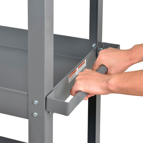 Shelf Truck is ideal for distributing components of various sizes and weights to workstations and assembly lines. 18 gauge steel shelves offer 3" deep trays with machine-rolled tray edges for superior strength and rigidity. Shelves are reversible to offer flat shelf alternative. Sturdy 60"H 16 gauge ribbed steel angle uprights offer lb. capacity. Steers easily with 5" x 1-1/4" polypropylene wheel ball-bearing casters (2 swivel, 2 rigid) and a convenient push handle. Durable powder coat finish. Assembles easily.
