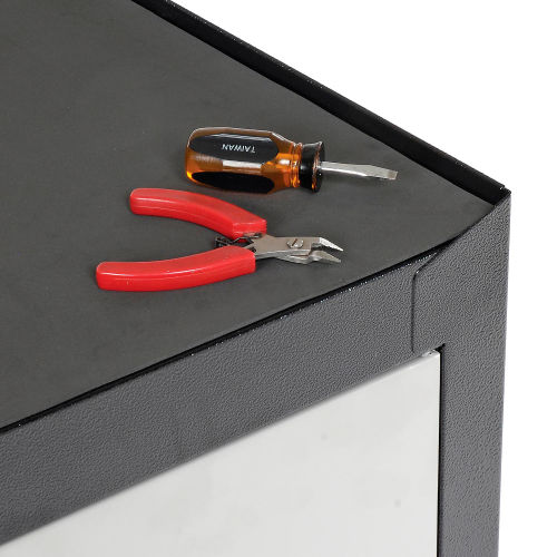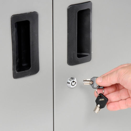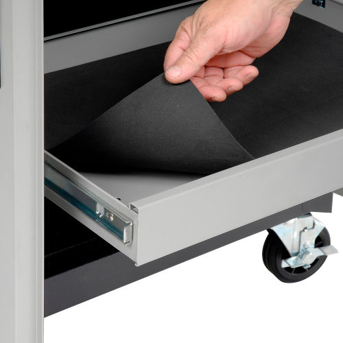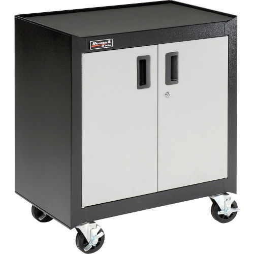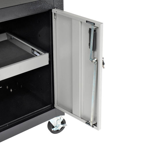 STEEL GARAGE FURNITURE WITH RECESSED HANDLES 2 Door Mobile Cabinet Configure the workstation that's right for you with this multi-unit steel garage system. Durable garage furniture components are made using high quality steel with 2 mm thick body and 2.5 mm thick framing for strength. Cabinet doors and drawer fronts feature a sleek silver finish for enhanced appearance. Cabinet doors feature a cylinder lock for security and recessed handles for a catch-free surface. Body and frame have a black finish. Includes a pull-out shelf with ball bearing glides. Mobile Cabinets move easily on 4" locking swivel casters. 3 Year Limited Warranty.