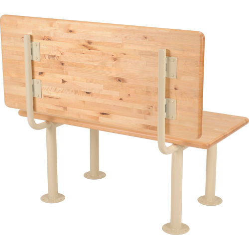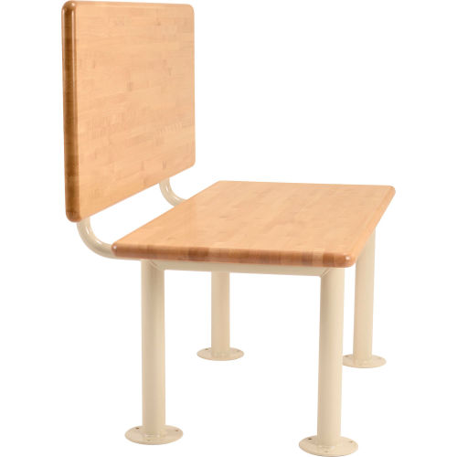 The ADA compliant locker room bench is exceptionally strong and durable, providing back support and comfort. Two-coat catalyzed finish maple hardwood top with radius on all sides and corners for comfort. 1-1/4" thick hardwood seat and 18" high back. Almond pedestals are made of heavy duty steel tubing with top and bottom bell flanges for attachment and placement.