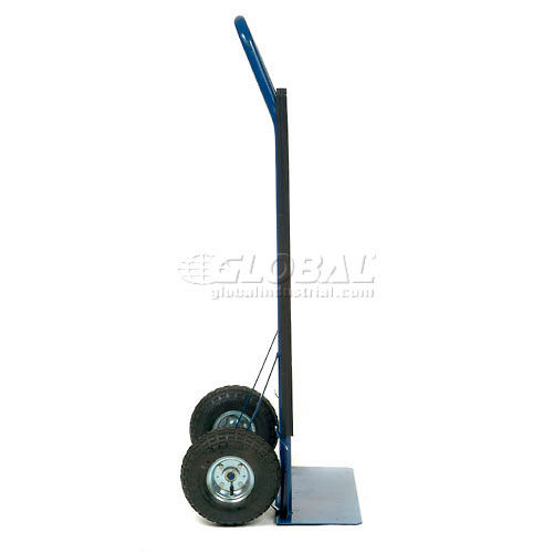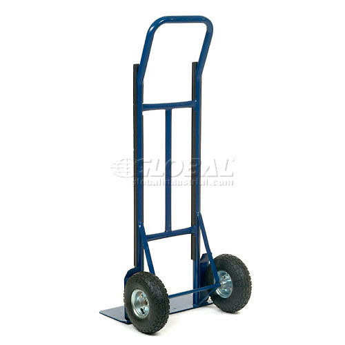INDUSTRIAL STRENGTH STEEL HAND TRUCK High quality, 1-1/4" diameter steel tube trucks are perfect for day-to-day work in warehouse, receiving and delivery. MIG welded throughout with double welding at critical stress points to withstand rugged use. Curved Handle offers easiest load control. 10" x 3-1/2" full pneumatic ball bearing wheels offer best load protection and roll smoothly over roughest surfaces. Durable enamel finish resists rust and scratches. Includes wheel plates and "wear-guard" strips to help prevent load damage, and an extra wide 20" x 7" noseplate to accommodate oversized cargo. Assembles easily. 5 Year Frame Warranty.