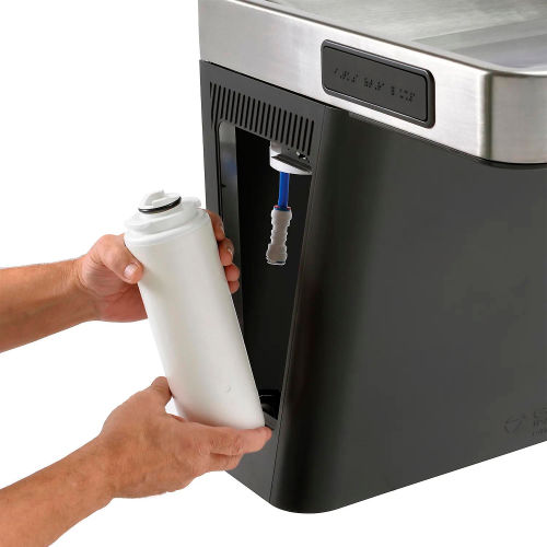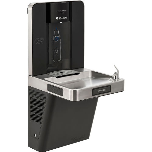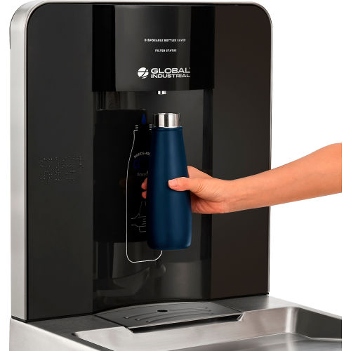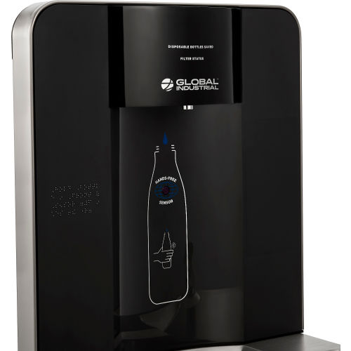 ✓ Includes a ready-to-use PFAS and microplastic filter ✓ Touchless activated bottle filling station ✓ Keyed access door with no tools needed for filter changes Simplify hydration with this filtered Global Industrial Refrigerated Drinking Fountain with Bottle Filler. This water fountain features a built-in sensor that dispenses water into bottles at a quick fill-rate of 1.0 GPM in a completely touchless experience. For those without a bottle to fill, the easy-touch front and side push-bar controls can be pressed by the forearm or elbow to provide water at a laminar flow from the flexible safety bubbler. The unit's display center counts the number of disposable single-use plastic bottles saved from waste and has LED bars that flash to alert when a filter change is required. Patented and other Patents Pending 3,600-gallon capacity PFAS and microplastic water filter to meet all your filtration requirements total PFAS filtration (PFOA+PFOS, PFNA, PFHxS & PFHpA reduction) along with NSF/ANSI 42, 53, & 401 compliance Textured graphite ABS plastic base & brushed stainless steel pan is rust-resistant Quick-turn valve allows unit to be used for bottle filling only Compressor has a 5-Year Limited Warranty.